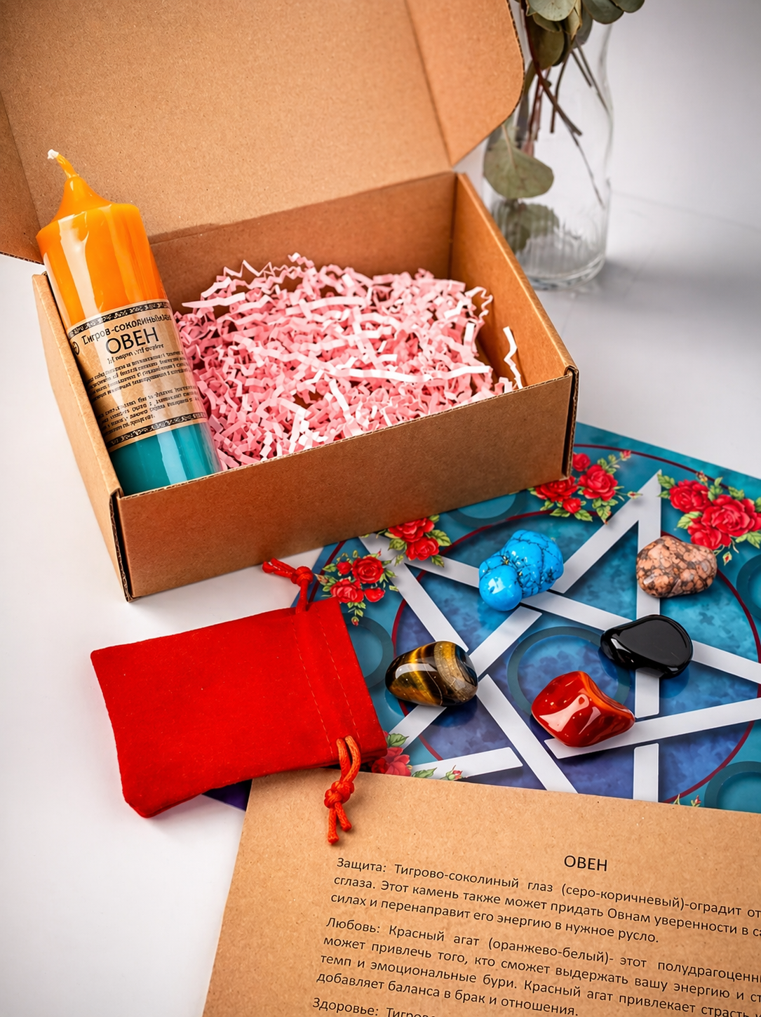 Старые легенды гласят, что камни по знакам зодиака распределил сам Бог. Все они имеют магические свойства- успокаивают, лечат, защищают или притягивают любовь. Если вы хотите чтобы чтобы талисман отдавал вам свою силу, нужно знать какие минералы вам подходят. Я подобрала камни с разными свойствами для каждого знака зодиака. Для того чтобы максимально раскрыть потенциал каждого камня, его необходимо активировать с помощью огня магической зодиакальной свечи, на специальном алтаре. В зодиакальный набор для Овна входят: свеча и алтарь с описанием ритуала, 5 полудрагоценных камней (тигрово-соколиный глаз, красный агат, туркенит, леопардовая яшма, соколиный глаз) с их характеристиками и бархатным мешочком для хранения, магические духи "Подарки судьбы" (в составе масло жожоба, мандарин, роза, розовое дерево, грейпфрут, жасмин) и порошок "Кровь дракона" с инструкцией- для усиления ритуала. В камнях допускается присутствие естественных природных неровностей, трещинок и включений. Минералы натуральные и могут отличаться незначительно размером и формой от представленных на фото. Размер камней 2,5 - 3 см. Каждый набор я дополнительно сонастраиваю с его владельцем, для этого мне необходимо знать Ваше ФИО и дату рождения, для заказа пишите мне в личные сообщения в МАХ или Телеграмм 8(926)297-25-05.