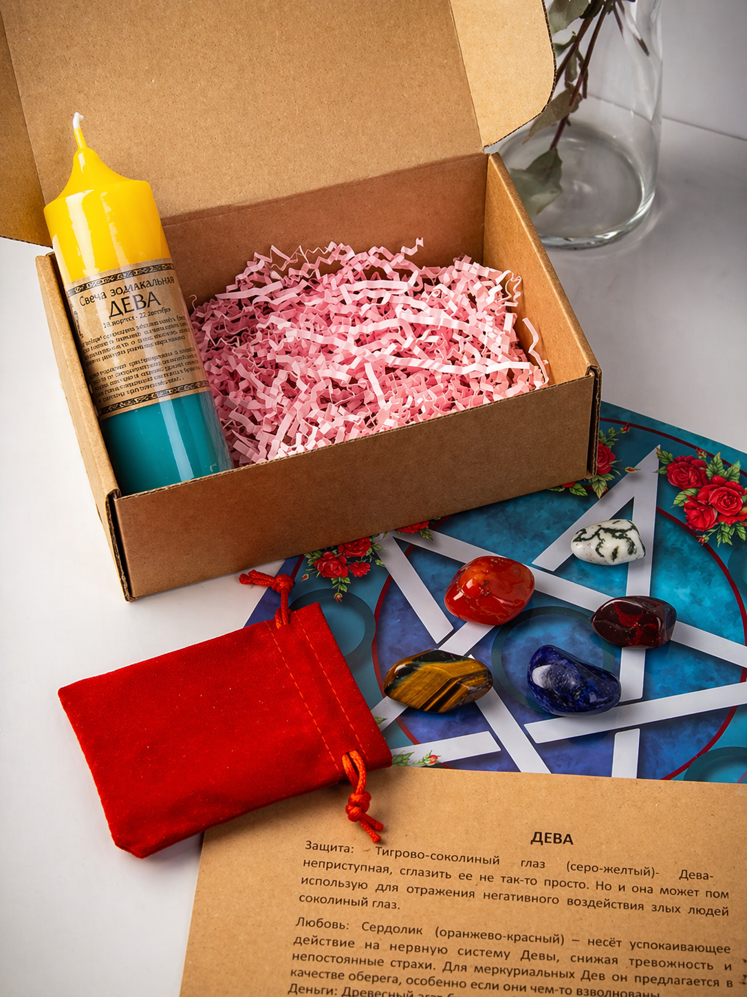 Старые легенды гласят, что камни по знакам зодиака распределил сам Бог. Все они имеют магические свойства- успокаивают, лечат, защищают или притягивают любовь. Если вы хотите чтобы чтобы талисман отдавал вам свою силу, нужно знать какие минералы вам подходят. Я подобрала камни с разными свойствами для каждого знака зодиака. Для того чтобы максимально раскрыть потенциал каждого камня, его необходимо активировать с помощью огня магической зодиакальной свечи, на специальном алтаре. В зодиакальный набор для Девы входят: свеча и алтарь с описанием ритуала, 5 полудрагоценных камней (тигрово- соколиный глаз, сердолик, древесный агат, брекчиевая яшма, содалит) с их характеристиками и бархатным мешочком для хранения, магические духи "Подарки судьбы"(в составе масло жожоба, мандарин, роза, розовое дерево, грейпфрут, жасмин) и порошок "Кровь дракона" с инструкцией- для усиления ритуала. В камнях допускается присутствие естественных природных неровностей, трещинок и включений. Минералы натуральные и могут отличаться незначительно размером и формой от представленных на фото. Размер камней 2,5 - 3 см. Каждый набор я дополнительно сонастраиваю с его владельцем, для этого мне необходимо знать Ваше ФИО и дату рождения, для заказа пишите мне в личные сообщения в МАХ или Телеграмм 8(926)297-25-05.