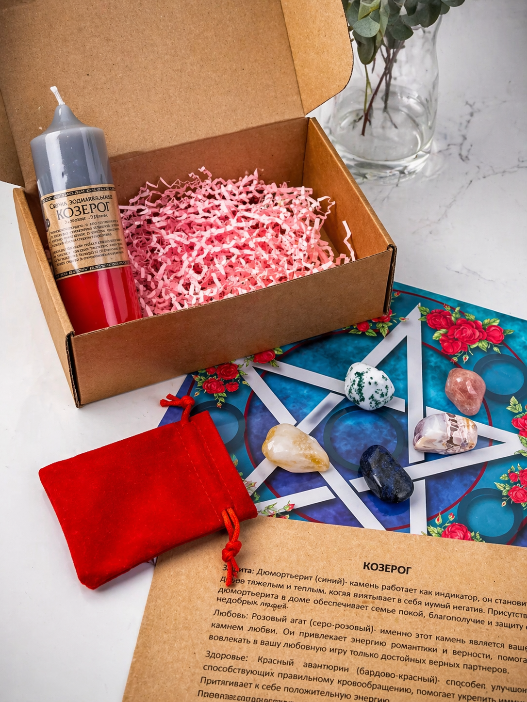 Старые легенды гласят, что камни по знакам зодиака распределил сам Бог. Все они имеют магические свойства- успокаивают, лечат, защищают или притягивают любовь. Если вы хотите чтобы чтобы талисман отдавал вам свою силу, нужно знать какие минералы вам подходят. Я подобрала камни с разными свойствами для каждого знака зодиака. Для того чтобы максимально раскрыть потенциал каждого камня, его необходимо активировать с помощью огня магической зодиакальной свечи, на специальном алтаре. В зодиакальный набор для Козерога входят : свеча и алтарь с описанием ритуала, 5 полудрагоценных камней (дюмортьерит, розовый агат, красный авантюрин, цитрин, древесный агат) с их характеристиками и бархатным мешочком для хранения, магические духи "Подарки судьбы"(в составе масло жожоба, мандарин, роза, розовое дерево, грейпфрут, жасмин) и порошок "Кровь дракона" с инструкцией- для усиления ритуала. В камнях допускается присутствие естественных природных неровностей, трещинок и включений. Минералы натуральные и могут отличаться незначительно размером и формой от представленных на фото. Размер камней 2,5 - 3 см. Каждый набор я дополнительно сонастраиваю с его владельцем, для этого мне необходимо знать Ваше ФИО и дату рождения, для заказа пишите мне в личные сообщения в МАХ или Телеграмм 8(926)297-25-05.