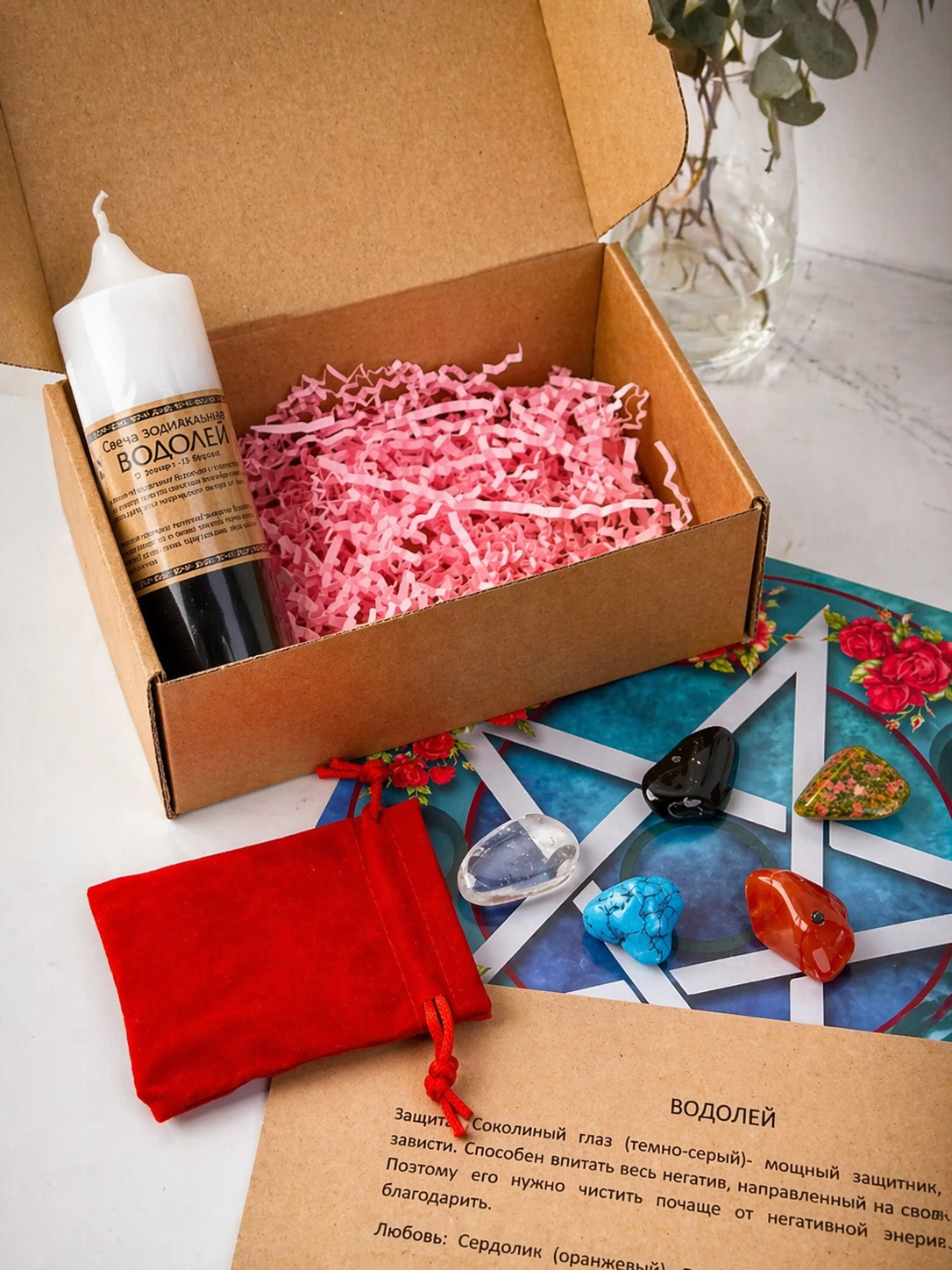 Старые легенды гласят, что камни по знакам зодиака распределил сам Бог. Все они имеют магические свойства- успокаивают, лечат, защищают или притягивают любовь. Если вы хотите чтобы чтобы талисман отдавал вам свою силу, нужно знать какие минералы вам подходят. Я подобрала камни с разными свойствами для каждого знака зодиака. Для того чтобы максимально раскрыть потенциал каждого камня, его необходимо активировать с помощью огня магической зодиакальной свечи, на специальном алтаре. В зодиакальный набор для Водолея входят: свеча и алтарь с описанием ритуала, 5 полудрагоценных камней (соколиный глаз, сердолик, горный хрусталь, унакит, туркенит) с их характеристиками и бархатным мешочком для хранения, магические духи "Подарки судьбы"(в составе масло жожоба, мандарин, роза, розовое дерево, грейпфрут, жасмин) и порошок "Кровь дракона" с инструкцией- для усиления ритуала. В камнях допускается присутствие естественных природных неровностей, трещинок и включений. Минералы натуральные и могут отличаться незначительно размером и формой от представленных на фото. Размер камней 2,5 - 3 см. Каждый набор я дополнительно сонастраиваю с его владельцем, для этого мне необходимо знать Ваше ФИО и дату рождения, для заказа пишите мне в личные сообщения в МАХ или Телеграмм 8(926)297-25-05.